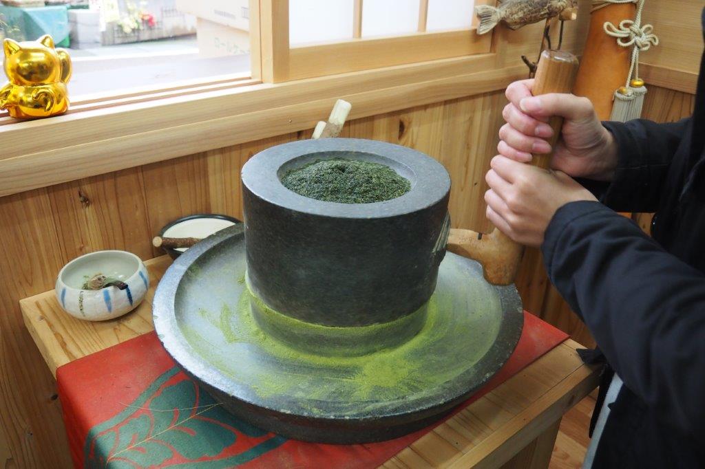 吹妖貝法螺的阿姨開心謝過我們,隨口聊起才知我們原來是來自台灣觀光客,驚訝之餘,立即邀我們去他的店坐坐喝茶,完全不是客套呢!來到大步危車站前唯一的一間店,以石臼磨茶、舀起一,二匙茶粉,加入一點水後,以吃茶的概念飲最健康喝下,又開了零嘴請我們吃,寒暄幾句,然後又跑去對面她的超市繼續工作了,留下我們慢用,並繼續跟隔壁桌的客人聊起台灣,整個過程過程讓我們快笑到肚子痛。