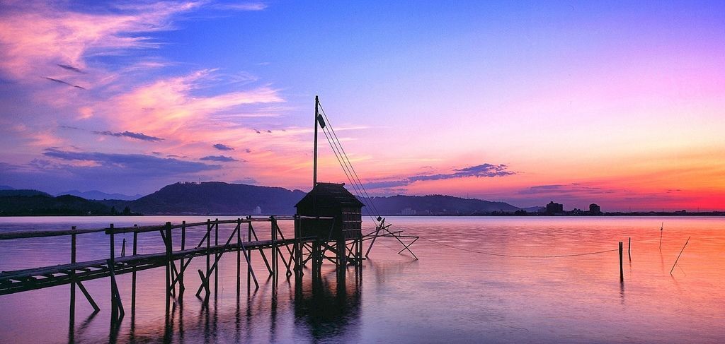 東郷湖的向晚,可看到仍保有傳統四手網漁法與夕陽勾勒的絶景風光(鳥取縣提供)