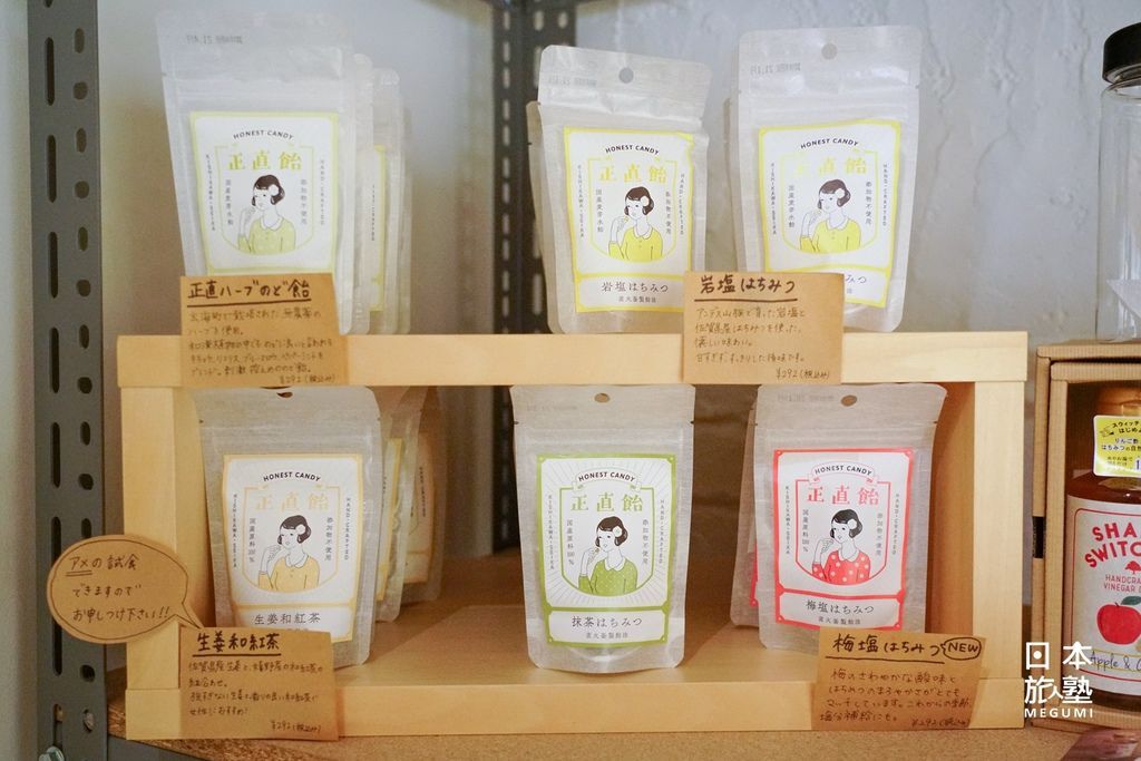 生薑和紅茶﹑岩鹽蜂蜜﹑梅鹽蜂蜜等多種特殊口味的「正直糖」