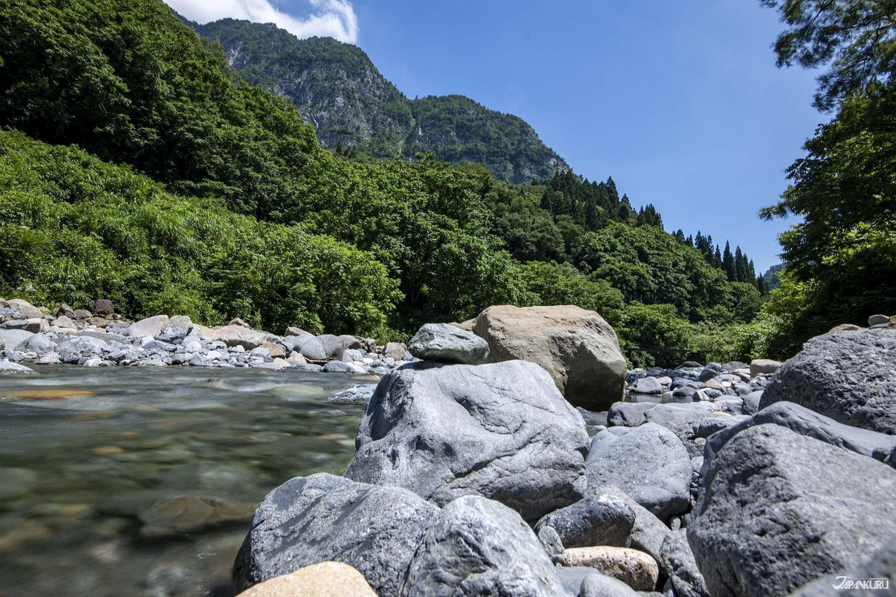 就在巍峨的明星山下,流瀉著清澈的小瀧川,河岸兩側能見得一座又一座巨大的翡翠原石——這就是糸魚川翡翠之境核心之一的「小瀧川翡翠峽」。小瀧川翡翠峽和另一處「青海川翡翠峽」,是糸魚川境內兩大翡翠產地,其中小瀧川翡翠峽更是日本最早的翡翠產地,甚至是全世界最古老的翡翠產地。作為糸魚川世界地質公園的重要景點之一,小瀧川翡翠峽亦被日本政府認定為國家天然記念物,年年有許多遊客慕名前往,見識那壯闊且特別的翡翠峽景色。