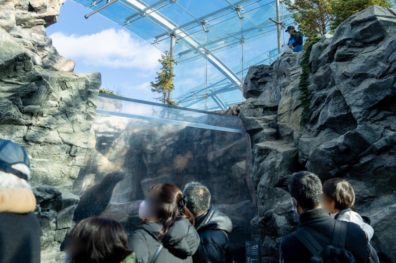 來到大人跟小孩都喜歡的海豹、海獅展區,又剛好遇到餵食解說時間,頓時櫥窗前擠滿了滿滿的人潮。
