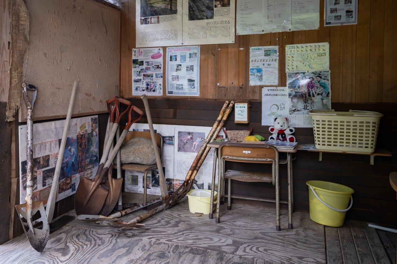 走進川原の湯っこ旁的小路後,右邊的小屋裡放著圓鍬等工具,可以免費租借。