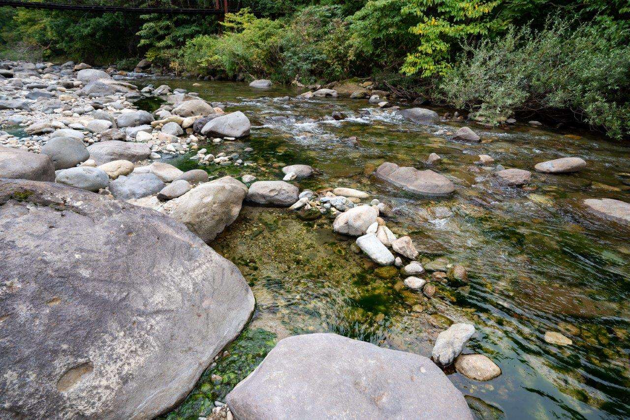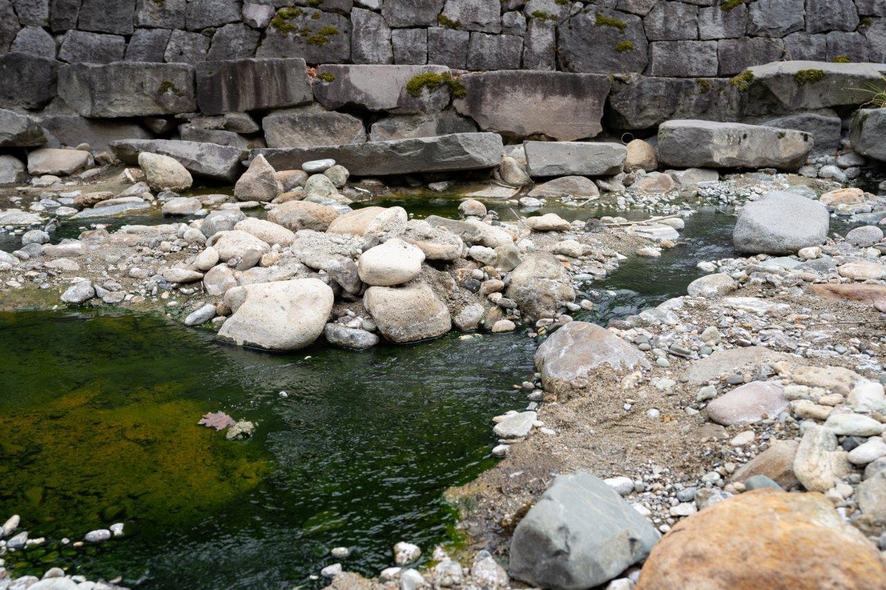 有沒有發現河床有些綠綠的呢?表示最近不是來泡足湯的旺季,行走時要稍微小心一下,如果來挖足湯的人多的話,綠色的青苔生物也會比較少,也會比較熱鬧一點。