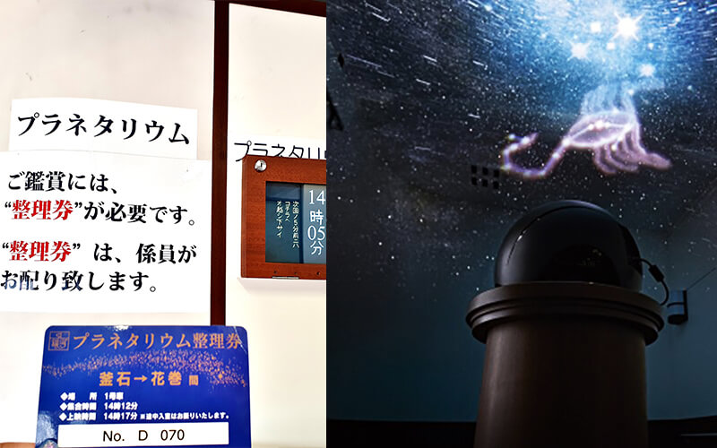 天文館為免費入場,但因入場人數有限所以需要事先拿號碼牌,建議上車後就先至1號車廂向工作人員索取。號碼牌上有兩個時間:一個是集合時間(集合地點是天文館外),另一個是演出的開始時間。