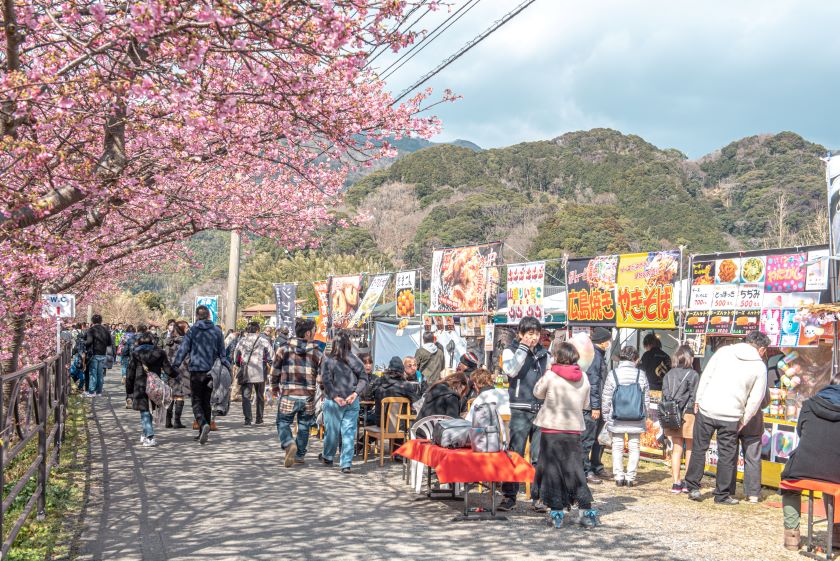 每年河津櫻櫻花季舉行的祭典皆是以河津櫻盛開期間為主,落在2月上旬至3月上旬間。2020年為2020.02.10至2020.03.10日,在這期間來的時候有櫻花也有各個小吃攤位,晚上會特別點燈,熱鬧的很。