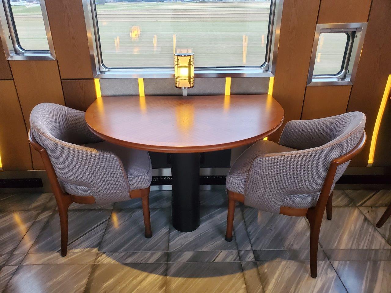 餐廳的座位有半圓形餐桌和方型餐桌兩種,如果是看風景的話,其實兩種座位坐起來都差不多,因為車窗夠大,不至於要一直歪著脖子。