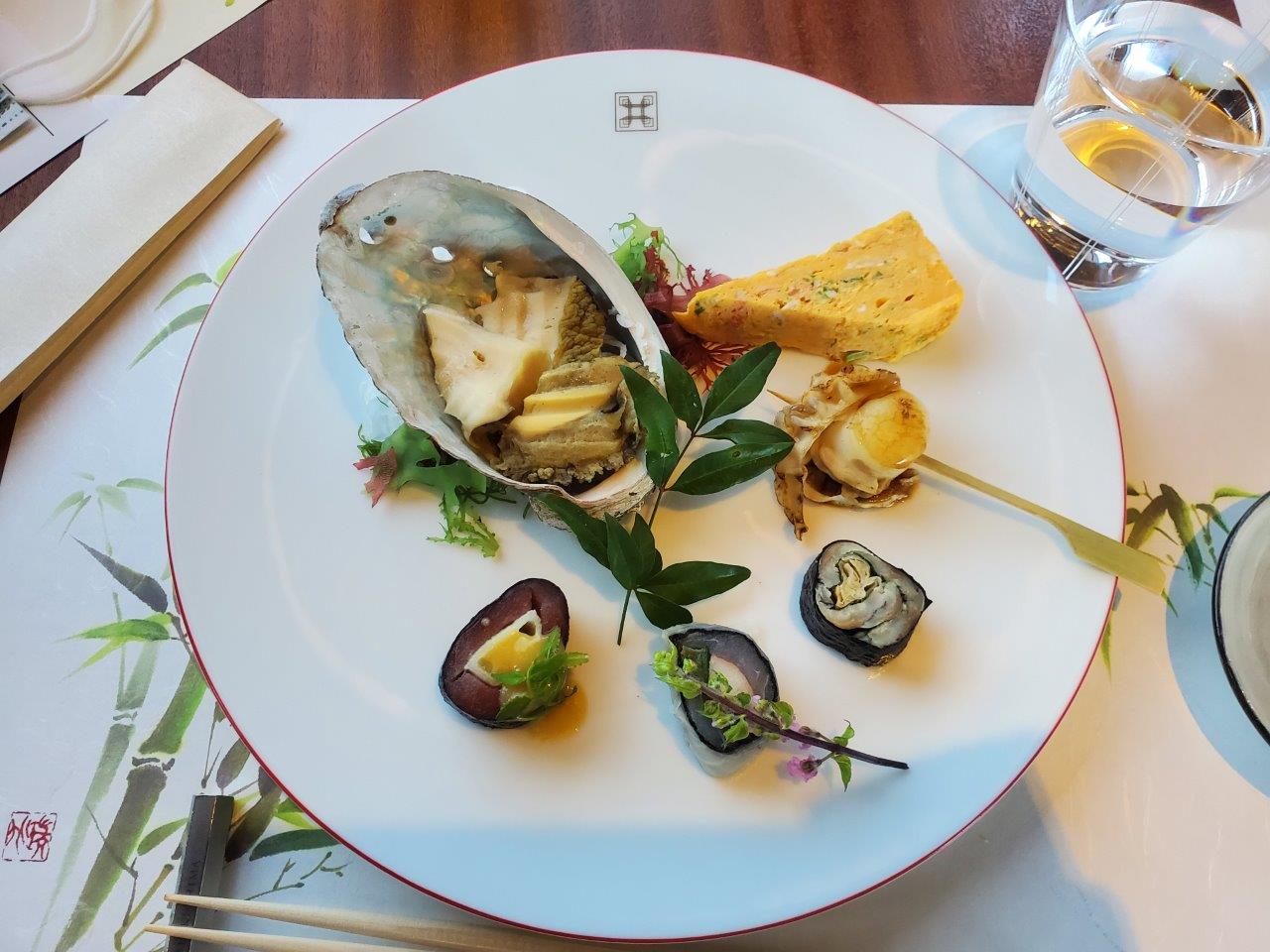◆茨城縣產蛤蠣龍蝦漬與彩蔬佐烤柑橘醬 這道菜以柑橘為主key,但是食材原有的鮮味都沒有被柑橘蓋過去。那個花可以吃,只是吃起來沒有特別的味道,就是跟吃一般的生菜差不多。