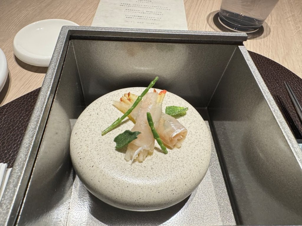 青森縣產的甘鯛捲著切得細細的青森蘋果,很清爽,是會讓人期待後續菜餚的完美開胃菜。