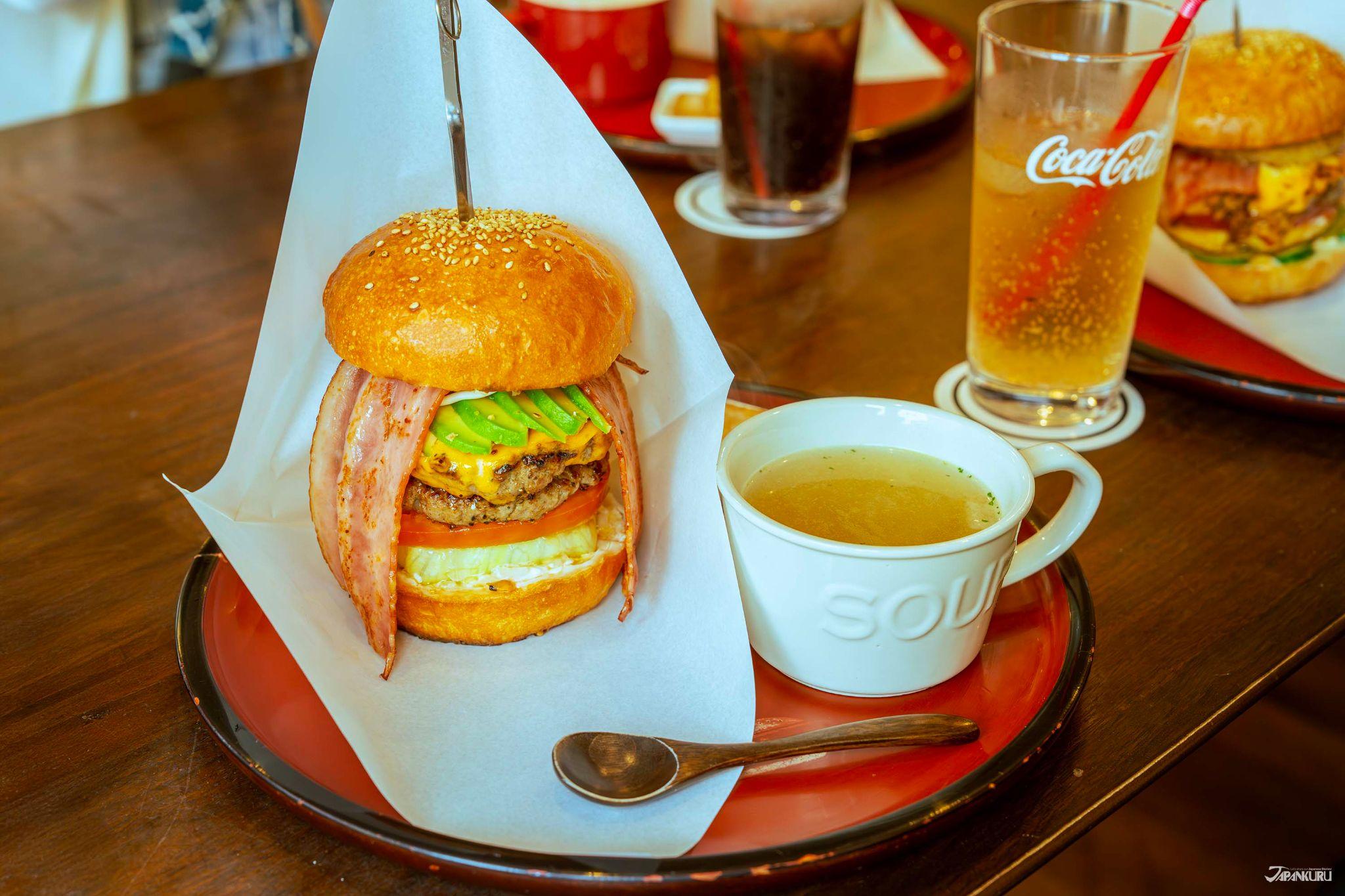 如果嚐了滿田屋的味噌田樂之後,還想再吃一些什麼的話,推薦你一樣在七日町通上面的一家漢堡店——會津漢堡。這家店看起來彷彿是日式民宅與美國西部牛仔常去的啤酒吧的結合,裡面座位不少,桌子上還都會放一些有趣的益智玩具,讓客人打發等待出餐的時間。