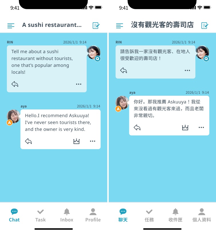 「突然好餓喔!好想來碗拉麵……」 「誒!我家附近有一家從爺爺那代傳到現在的拉麵店,現在已經是第三代了。我也是從小吃到大,口味數十年如一。每到下班或放學時間,店裡總是擠滿了上班族。他們好吃的祕訣就是特製的辣油……」 之類的,這樣的對話,就像朋友之間的互動,既真實又親切。因為是出自日本人真心推薦的地點,自然而然更能打動人心,這也是Ask Japan最大的魅力。 至於語言隔閡則完全不用擔心。Ask Japan內建自動翻譯功能,能將你用母語提出的問題即時翻譯成日文顯示給日本用戶,而日本人的回覆也會自動翻譯回來,確保雙方都能輕鬆交流。