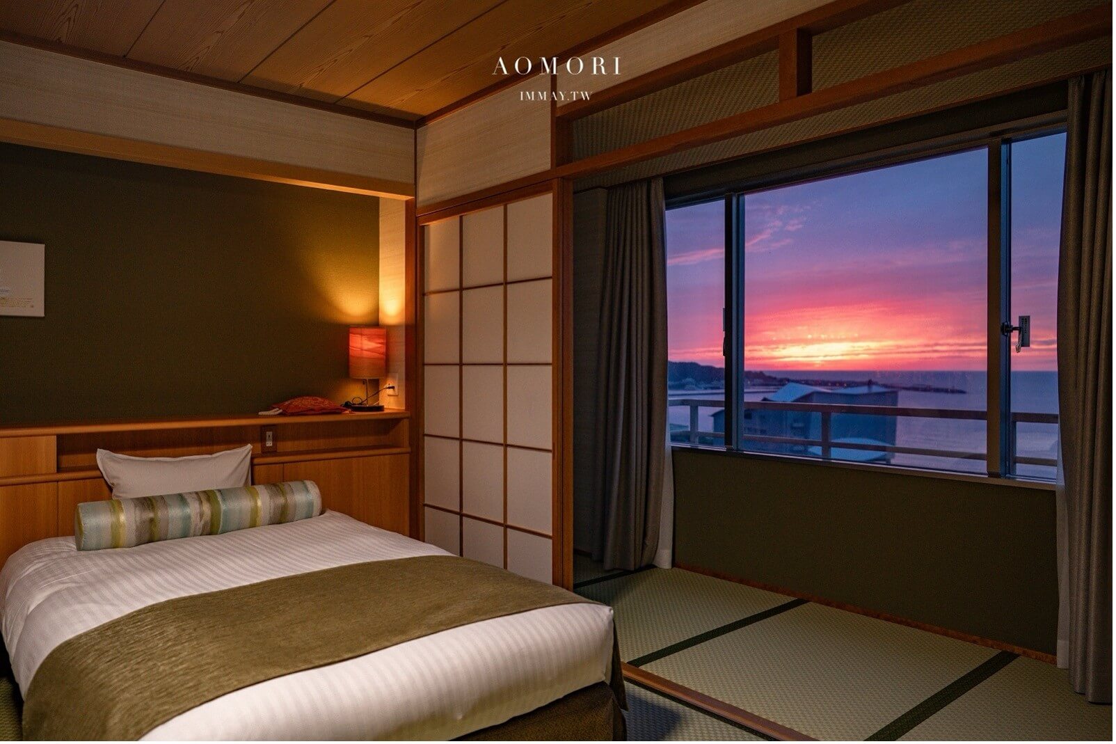 飯店面向日本海,能在溫泉裡邊泡湯邊看夕陽落入海平面。經過一整天的健行與移動,這樣的收尾再幸福不過。 準備以一頓豐盛的海邊晚宴和溫暖的溫泉,迎接這趟跨越秋田與青森的自然探索之旅的尾聲。