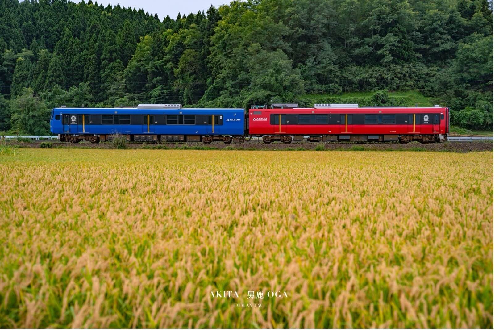 特別在鐵道沿線找了個絕佳的點,拍下了男鹿線ACCUM列車在金黃稻田間行駛的身影。 藍紅搭配的列車在秋天平原的襯託下格外亮眼,瞬間有種「偽鐵道女子達成心願」的成就感。對我來說,旅行不只是景點,而是把每個瞬間都收藏成照片與回憶。
