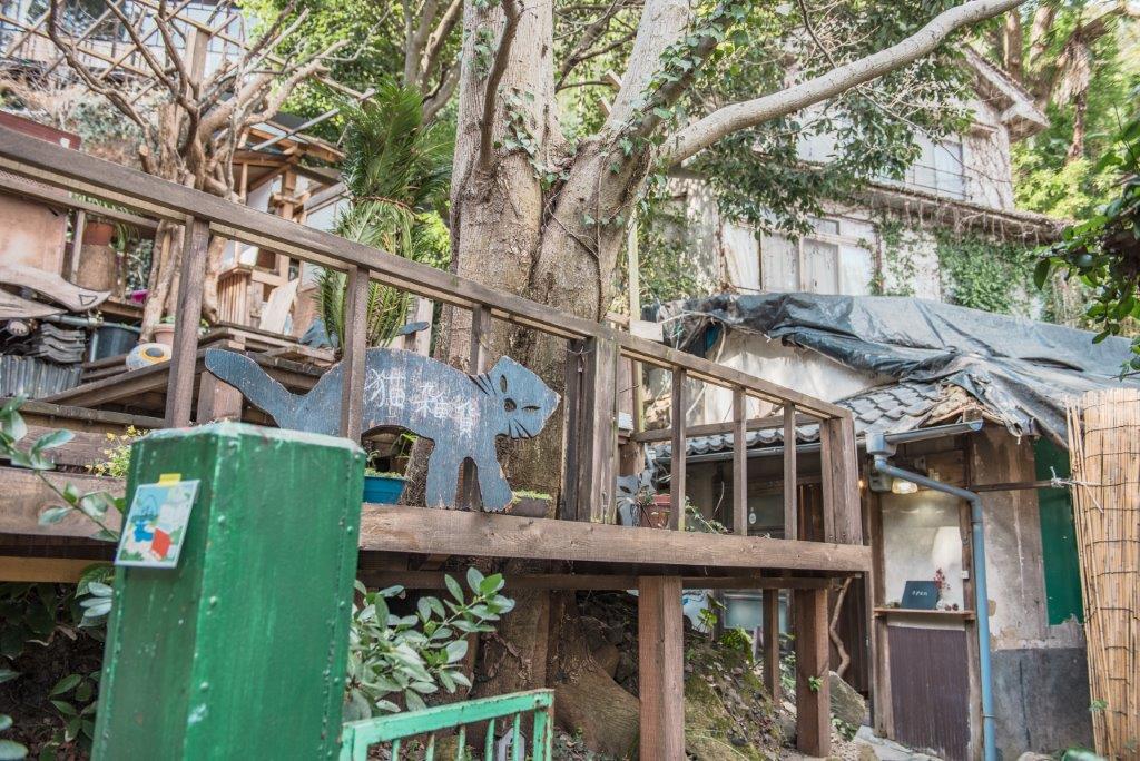 貓之細道有很多特別的店,像是可以看到海景、山景的咖啡館,比方說這間隱匿於樹林間的「梟之館」(梟の館)。