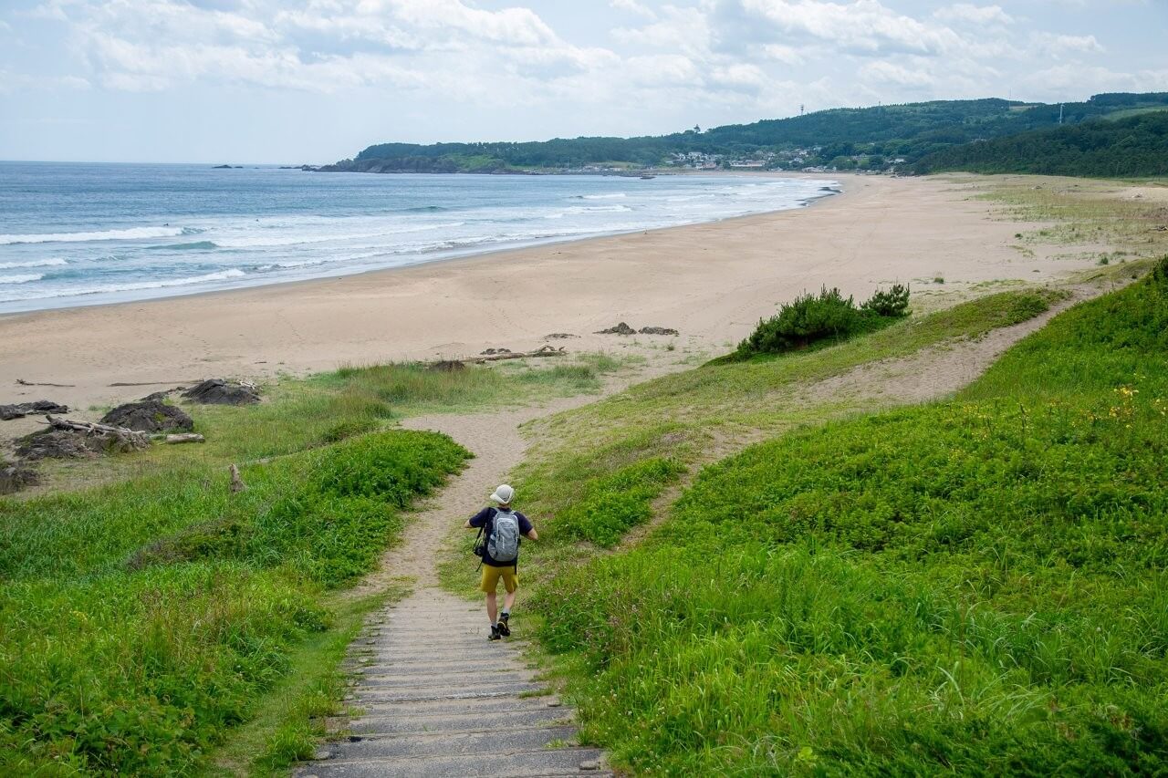 陸奧潮風步道,是沿著太平洋海岸延伸的長距離步道。在這趟行程中,將行走於風景與人們生活氣息依然濃厚的路段。從斷崖上眺望遼闊的海景、白色沙灘、松林間的小徑,以及靜靜佇立的漁村。每日行走距離的安排不勉強身體,比起負擔,更重視讓五感自然開啟的感受。