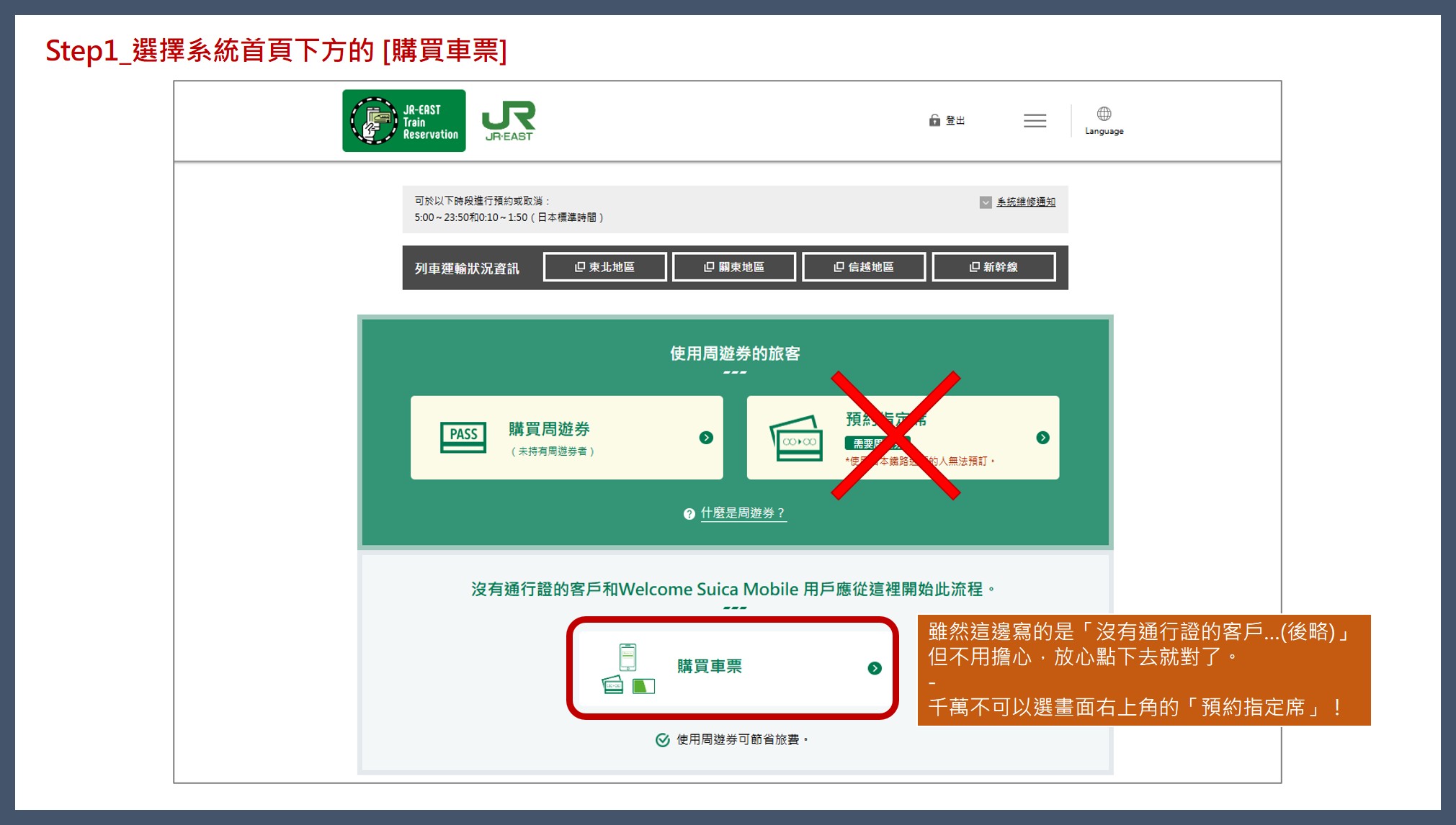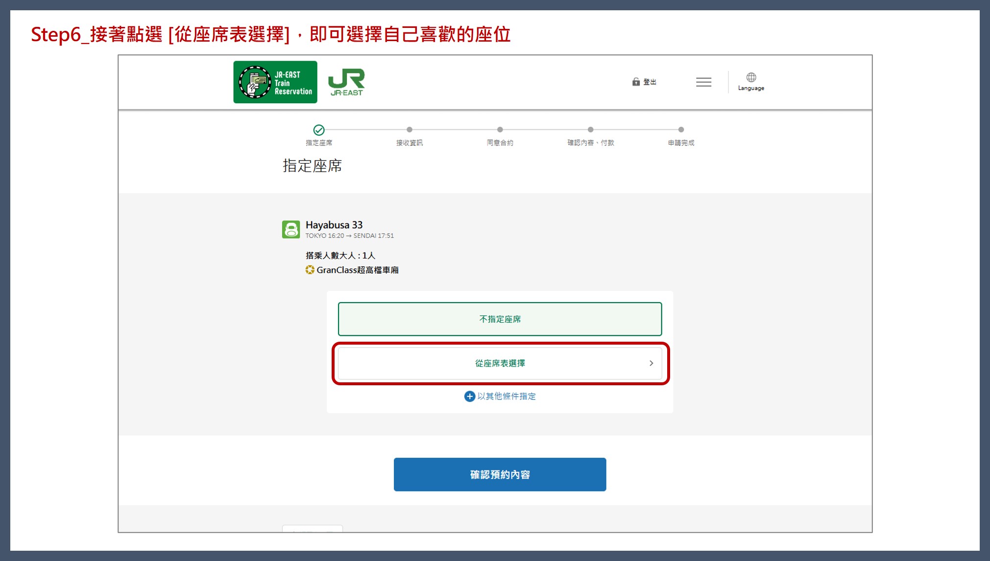 右上方的 [預約指定席] 是訂不用加價的普通車廂指定席。