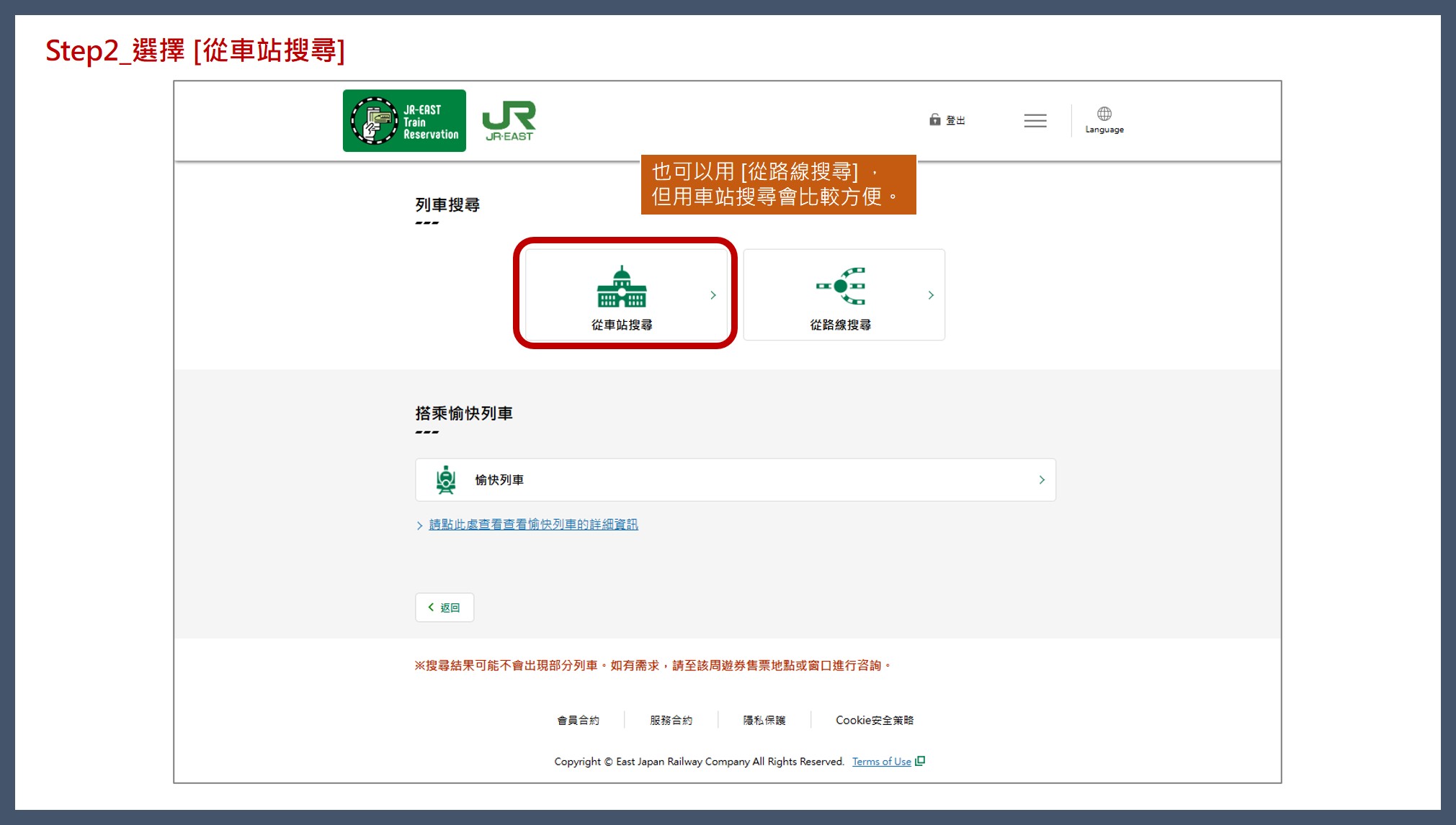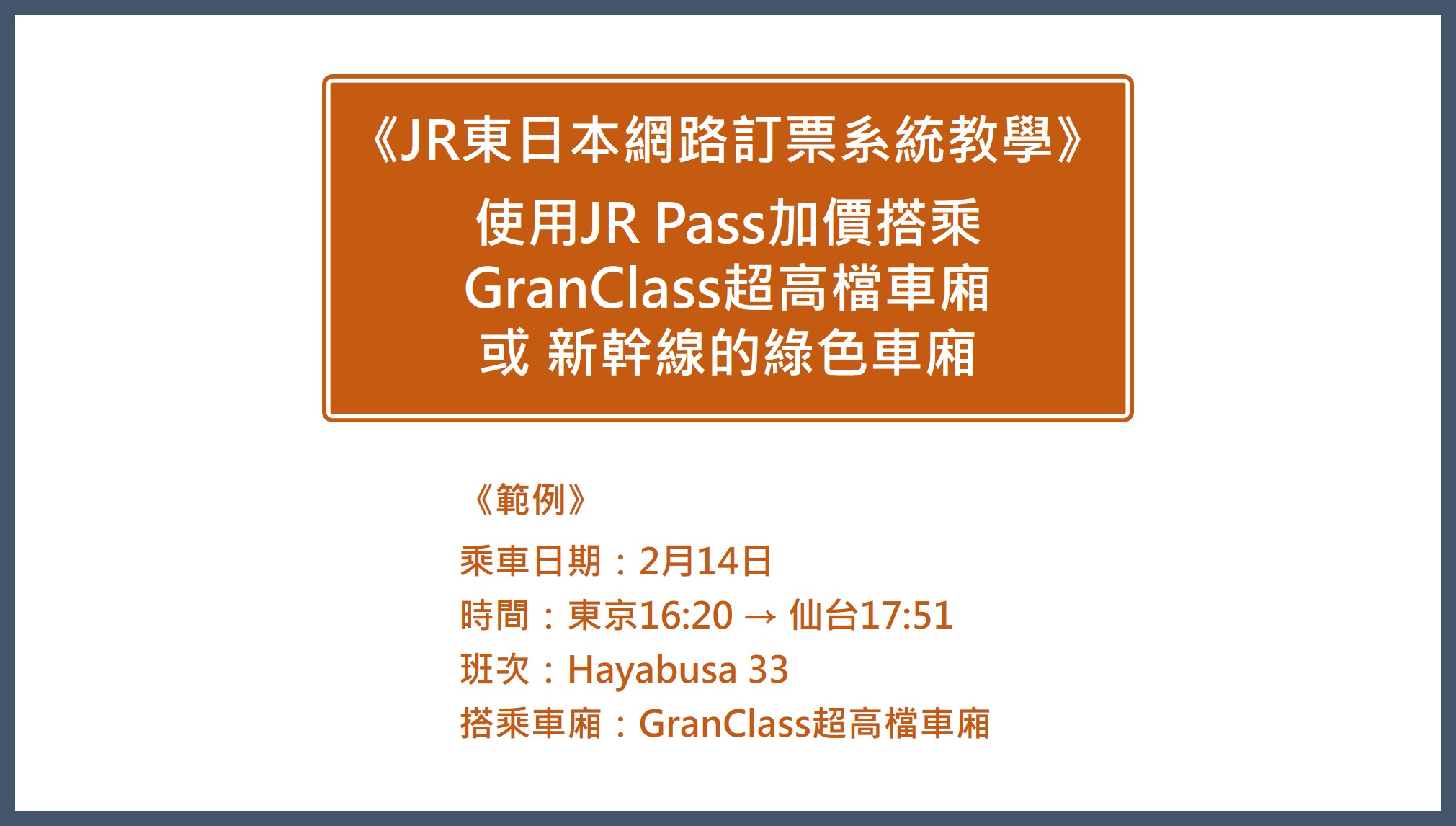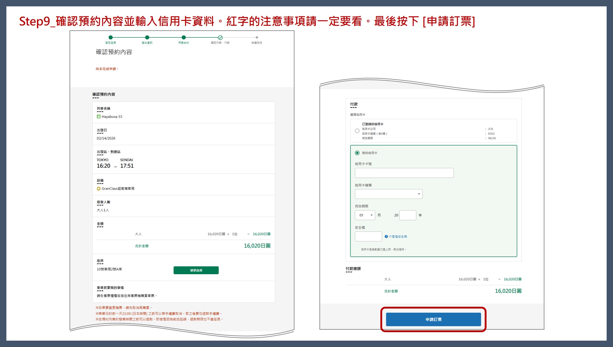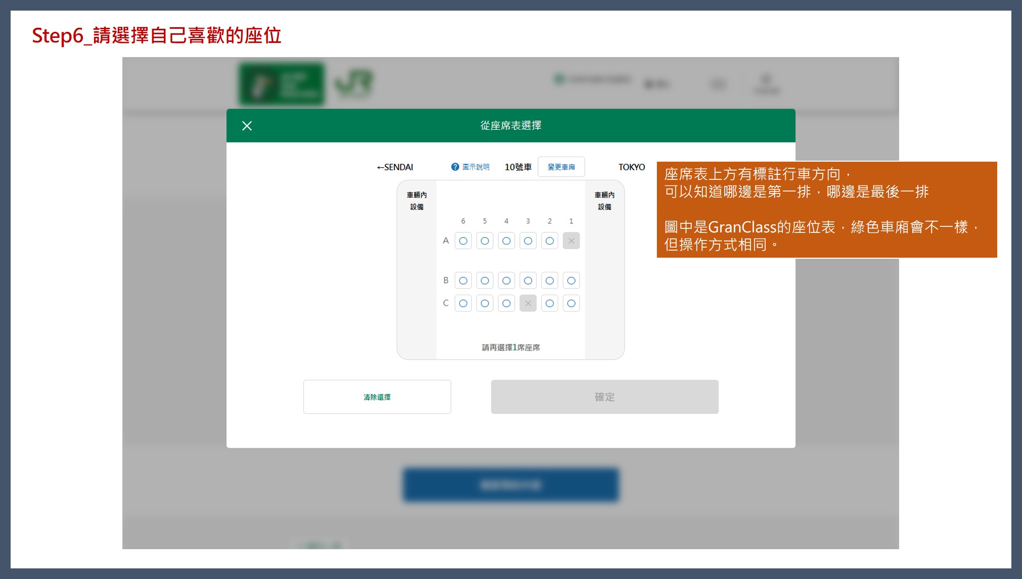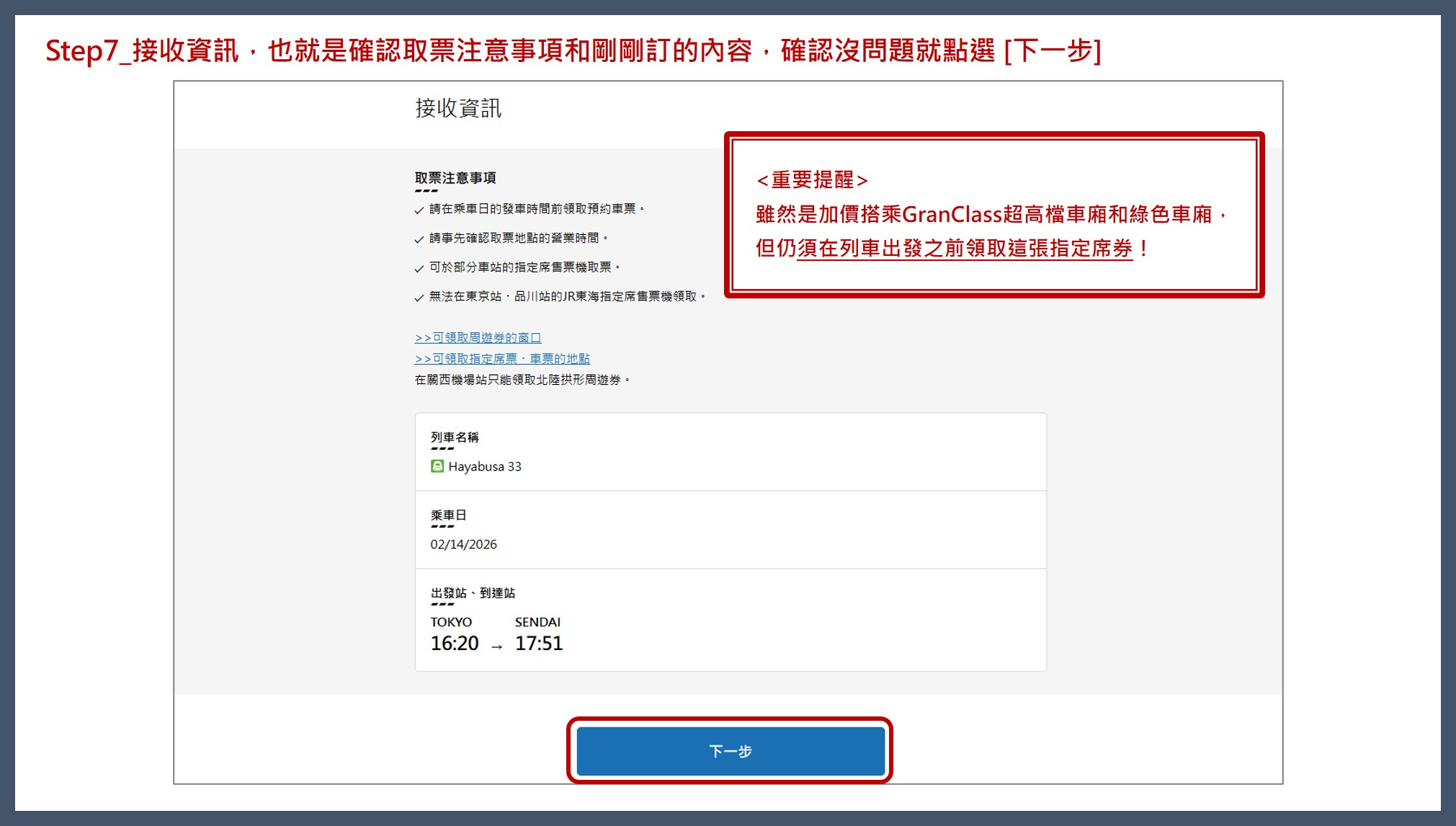 不管是加價搭乘GranClass超高檔車廂還是綠色車廂,[我只購買特快車票等] 一定要打勾。