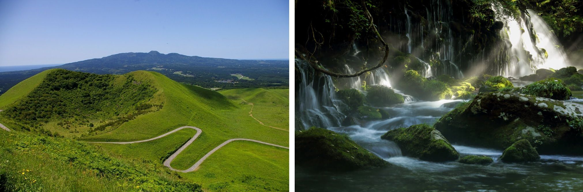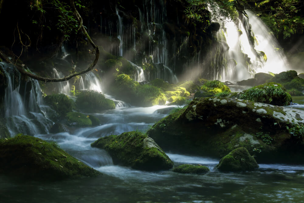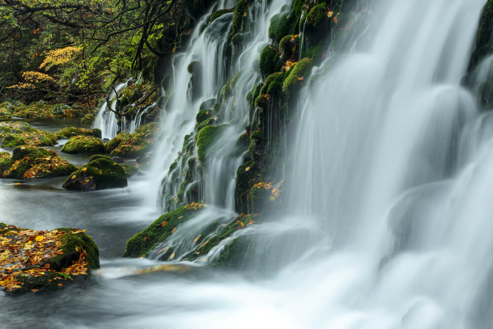 覆滿苔蘚的岩石與飛濺的水花交織而成的景色,看起來相當夢幻。元瀧伏流水的照片在網路上相當廣傳,但更推薦大家來感受實際的湧泉水聲與山間清涼的空氣。