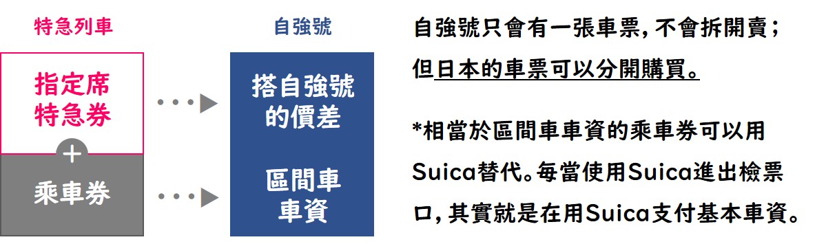看到這裡,各位可能會有點疑惑:我都買好ticketless特急券了,為什麼還要用Suica/紙本車票進出站呢?這是因為日本將車票結構全部拆開,讓你可以同時購買,也可以分開購買。