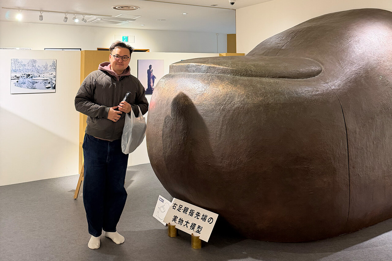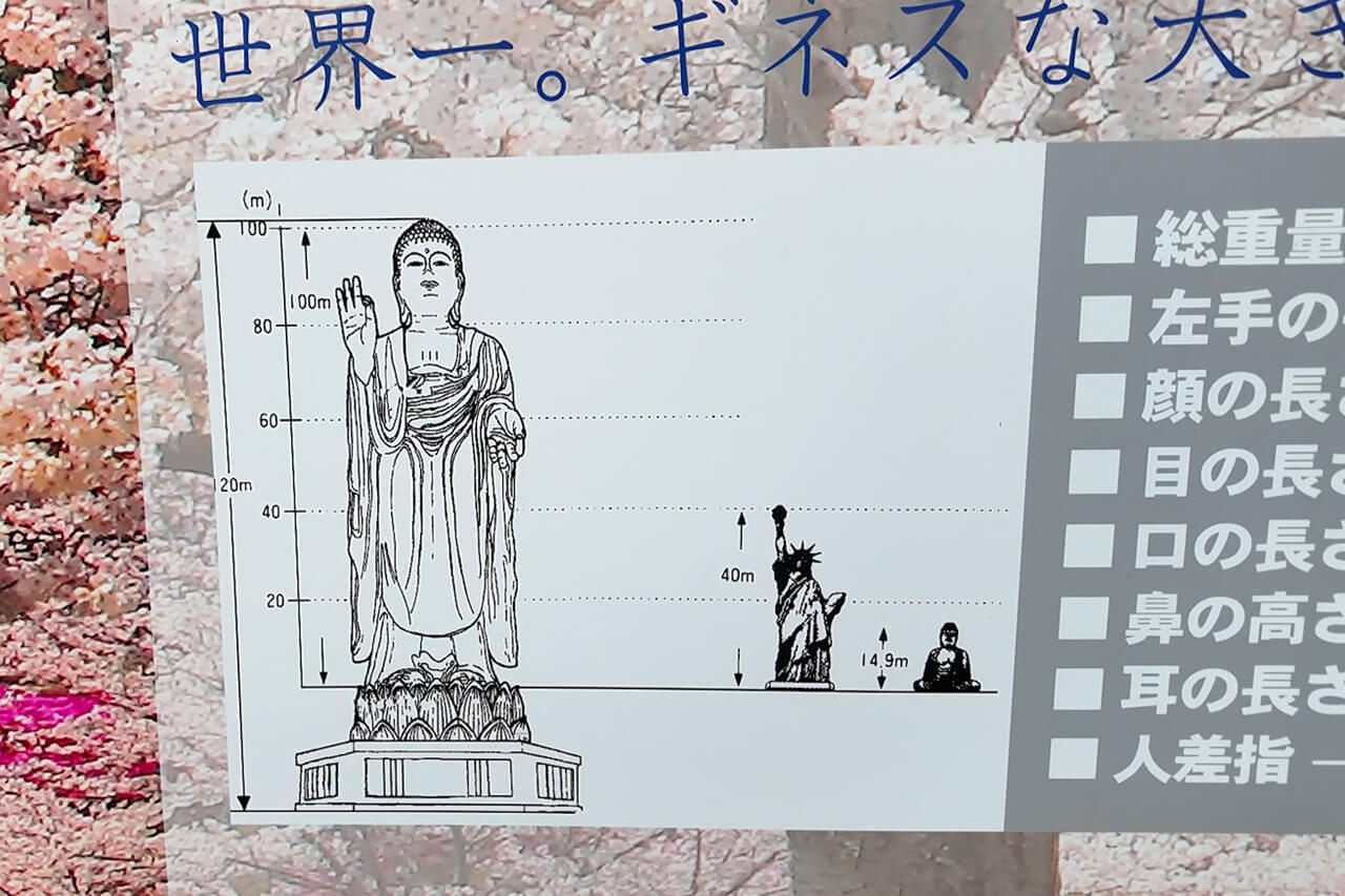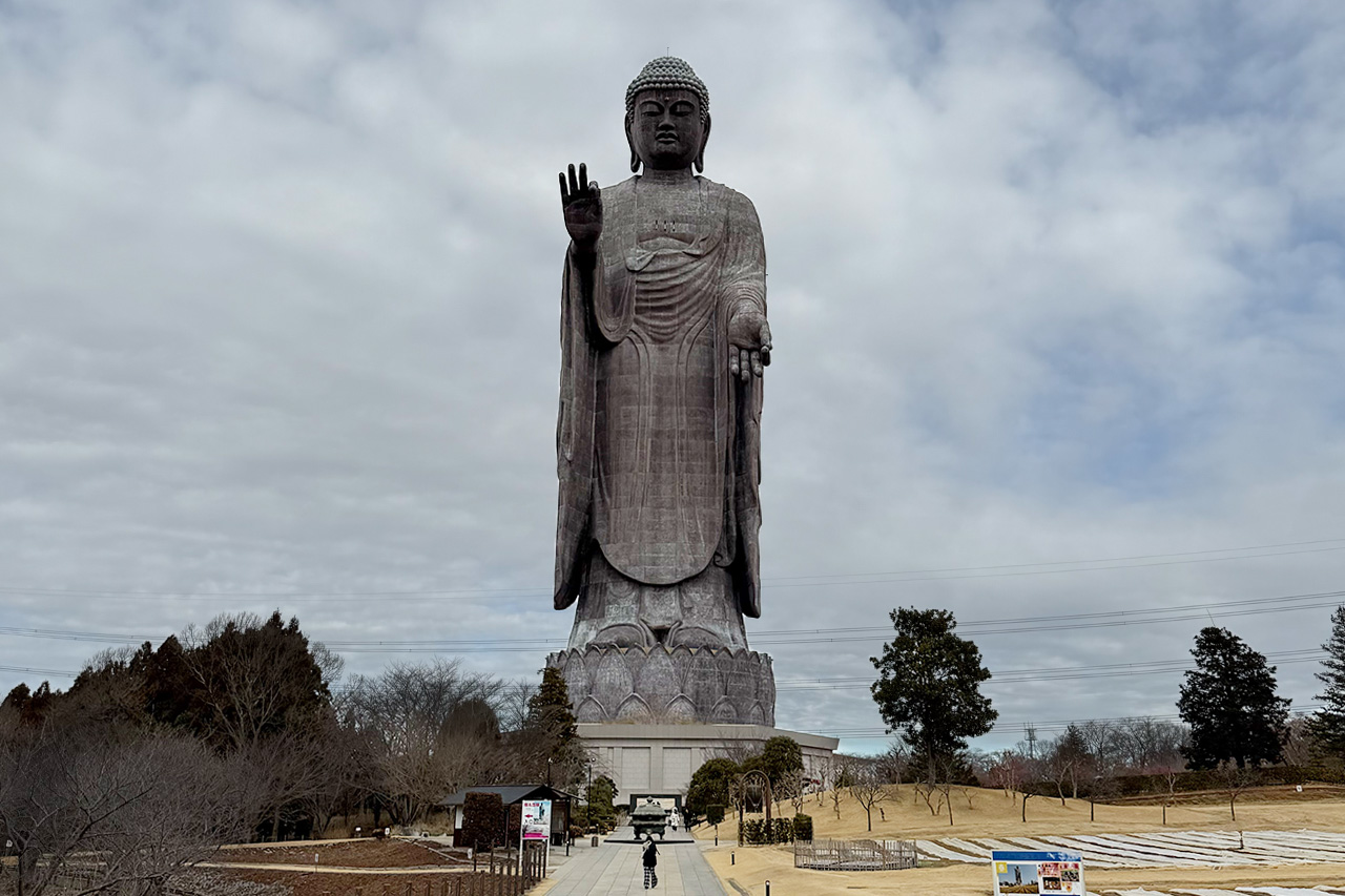 離開土浦平原,遠遠便能看見一座莊嚴地矗立在天地間的巨大地標——牛久大佛。 這尊正式名稱為「牛久阿彌陀大佛」的青銅立像,是為了紀念淨土真宗創始人親鸞聖人而建,並於 1992 年完工。 其規模之大,高達 120 公尺(佛身 100 公尺,底座 20 公尺),高度足足是紐約自由女神像的三倍,就連奈良大佛在它身旁也僅及於腳踝。 現場展示的實物比例模型更是驚人:大佛僅是一個腳趾的體積,就讓成年人顯得渺小。