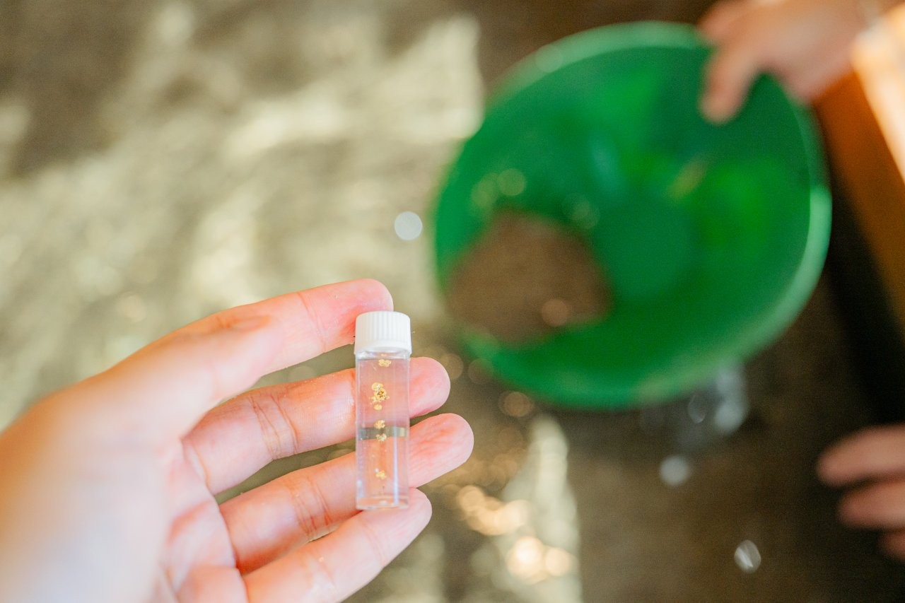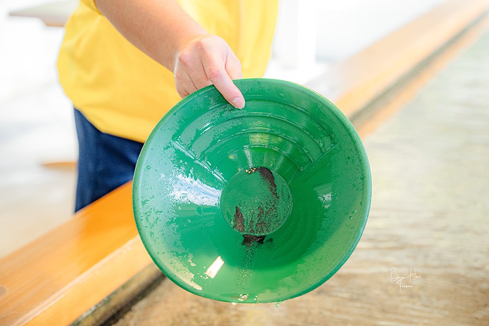 我撈了很久依舊無所獲,最後工作人員看不下去幫我,以至於成績沒那麼難看,當下開心地稱呼他為老師。(照片是我跟其他夥伴集中的成果) 可以將採集到了砂金付費制作成喜歡的吊飾收藏在身上,作為幸運象徵。