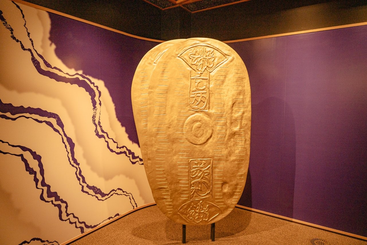 以前挖取金礦後在佐渡製成小判,江戶時代經濟有一部分是佐渡貢獻支撐。此為展示區域內唯一可開放大家拍攝的「小判」,將以前的小判大小放大至26倍。